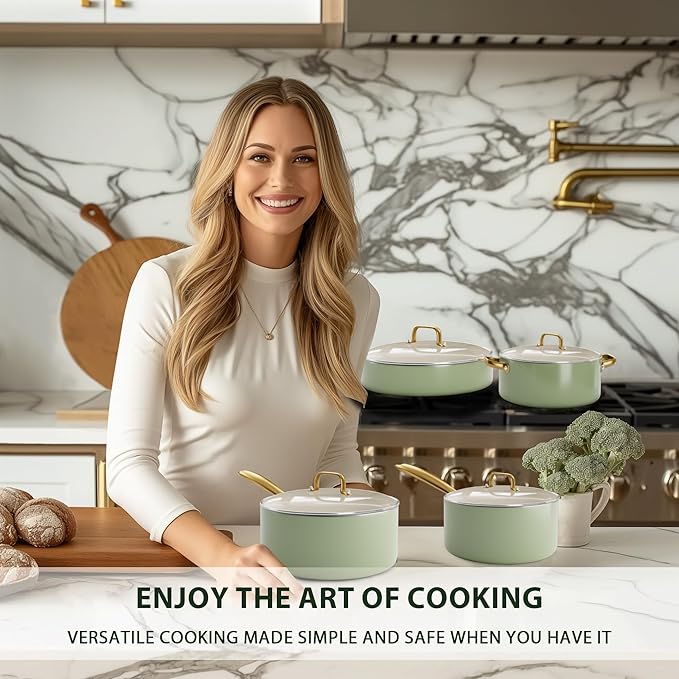 - Naturally Nonstick: No more sticky or difficult-to-clean problems. The Ceramic Cookware Set require less oil or butter for cooking and minimal scrubbing for a spotlessly clean, giving you a healthy and easy at-home culinary experience.