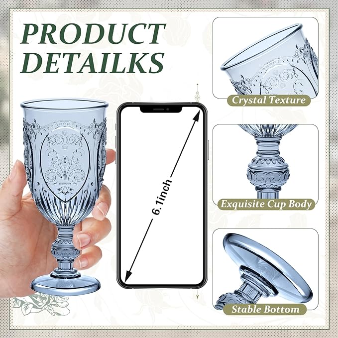 - Elegant Design: our vintage wine glasses set features a European vintage style and embossed design, comfortable to hold in the hand; Use our cups to sip your favorite drinks with your guests at your party and experience the irresistible vintage beauty, add a touch of elegance to your party and impress your guests