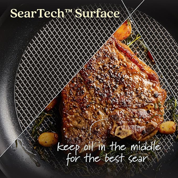 - THE ULTIMATE SEAR: No other nonstick frying pans have it. Exclusive SearTech(tm) technology combines an innovative base and stainless steel mesh engineered to keep oil in the middle of the skillet surfaces, letting heat and fats unite for incredible caramelization and browning