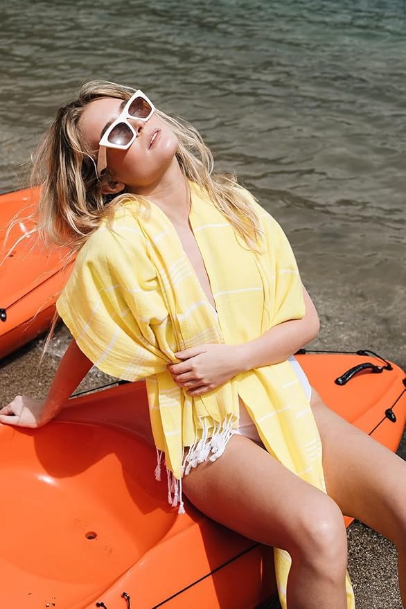 Madamelique Turkish Beach Towel Oversized - 39 x 74 - Quick Dry - Sand Free - Extra Large - Prewashed Beach Towels - Summer Gift - Beach Essentials - Travel Towel (Mediterranean Without Bag, Yellow)