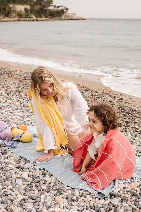 - Made from top-notch, sustainably sourced recycled Turkish cotton and OEKO-TEX certified waterproof dyes, our Turkish beach towels feature a unique flat weave that won’t trap sand. Say goodbye to beach sand in your car and bathroom!