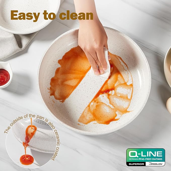 - Scratch Resistant: Crafted with German GREBLON ceramic coating, our cookware offers superior scratch resistance compared to traditional non-stick coatings. This means you can confidently use metal utensils without concerns about damaging the surface. Moreover, the ceramic coating extends to the exterior of the pot and pan, ensuring durability and protection inside and out