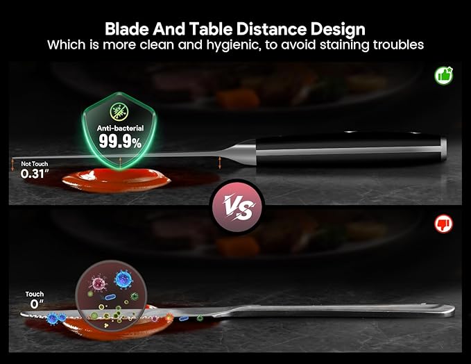 - Healthy and Non-staining: We have redesigned the traditional steak knife to address the health hazards caused by the knife coming into contact with the table during meals and the increased burden of cleaning. As a result, we have determined that a blade suspension height of 0.43 inches ensures the well-being of you and your family