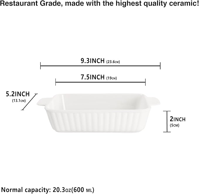 - Suitable size - Baking pan 7" Lx 4.5"W x 1.3"H Inch Includes double handles size 9.3" L, Normal Capacity 20 Ounce; The Rectangular baking pan design, It can be used in the oven, microwave, freezer and dishwasher. and ovens up to 500°F. NOTE:1, No direct fire and induction cooker. 2, Can't be thrown into cool water directly after leaving the oven or microwave.