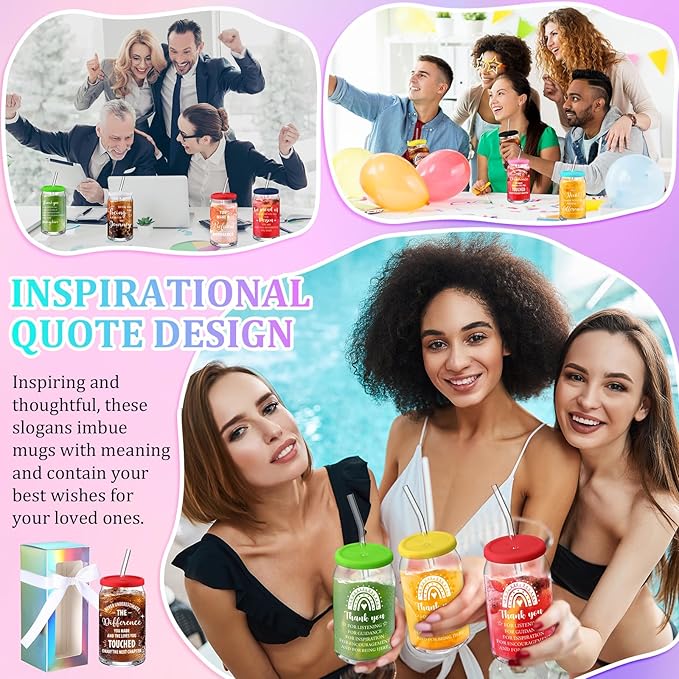 - Appreciation Gifts Set: you will receive 12 set appreciation gift boxes set, including 12 pcs 16 oz glass cups with clear texts printed on the surface (with 12 bamboo lids, 12 glass straws, and 12 glass straw brushes), and 12 pcs 7.48 inch glass cup gift boxes (with 12 ribbons); Sufficient quantity makes it convenient for you to use anytime and anywhere, and it is a very practical and exquisite combination set