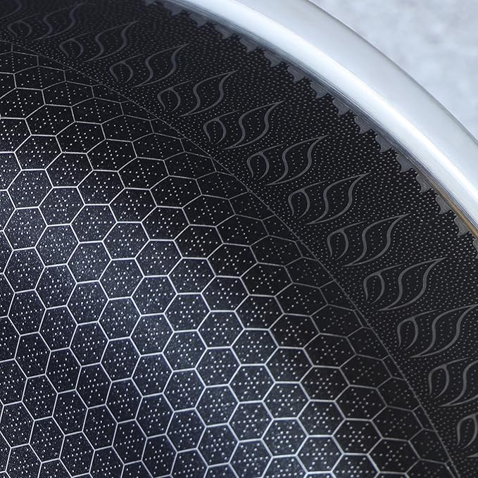 - 【HEXAGONAL NONSTICK SURFACE】-CATHYLIN wok pan developed Tri-ply Construction Body, Guarantee of Quality,aluminum between two layers of stainless-steel-tri-ply construction ensures the wok’s conduction of consistence and heat.The saute pan is PFOA-free and can be used without worry.