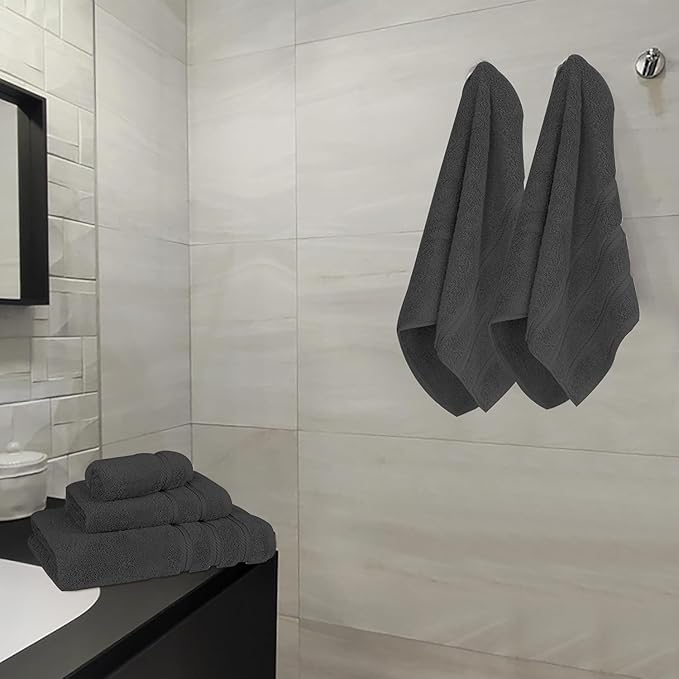 - Complete 6-Piece Set with Exact Dimensions – This coordinated set includes 2 bath towels (27"x54"), 2 hand towels (16"x28"), and 2 washcloths (13"x13"), providing all the essentials for a fully outfitted bathroom, whether at home, in an apartment, or in a guest space.