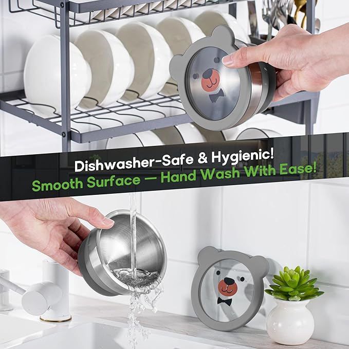 - 𝗡𝗼𝗻-𝗦𝗹𝗶𝗽 𝗦𝗶𝗹𝗶𝗰𝗼𝗻𝗲 𝗦𝘂𝗰𝘁𝗶𝗼𝗻 𝗖𝘂𝗽𝘀: Ensures the bowl stays securely in place, preventing messes and spills during mealtime