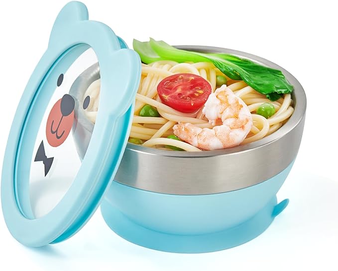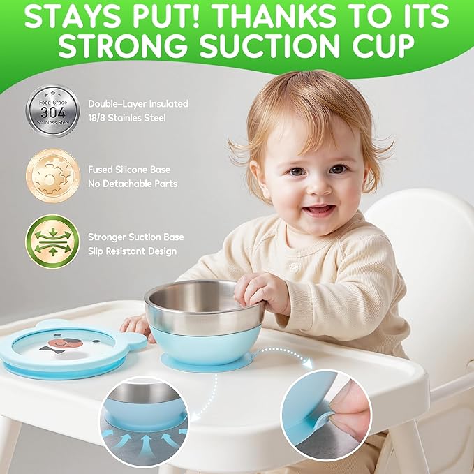 Suction Bowl and Spoon Set for Babies and Toddlers Non-Slip Silicone Suction Cups, Advanced 304 Stainless Steel Bowls, Double-Layer Insulation, and BPA-Free Lids Food-Grade Safety BLUE