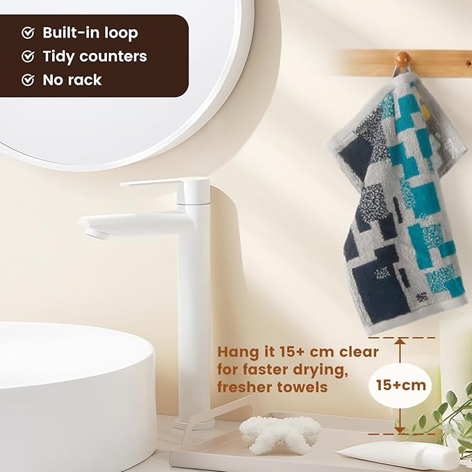 - Hanging Convenience — Every washcloth comes with a reinforced corner loop for secure hanging—no slipping, quicker air-drying, and tidier countertops