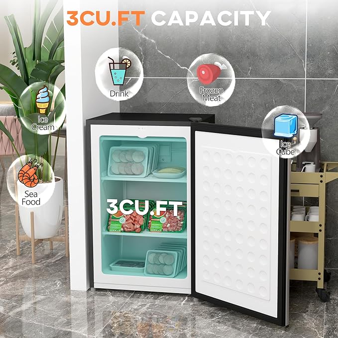 - 3Cu.Ft Capacity & Compact Design: This small freezer has a capacity of 3Cu. Ft for your seafood, meats, frozen food, and more. The compact design makes it great for an apartment, motor home, dormitory, or home office.