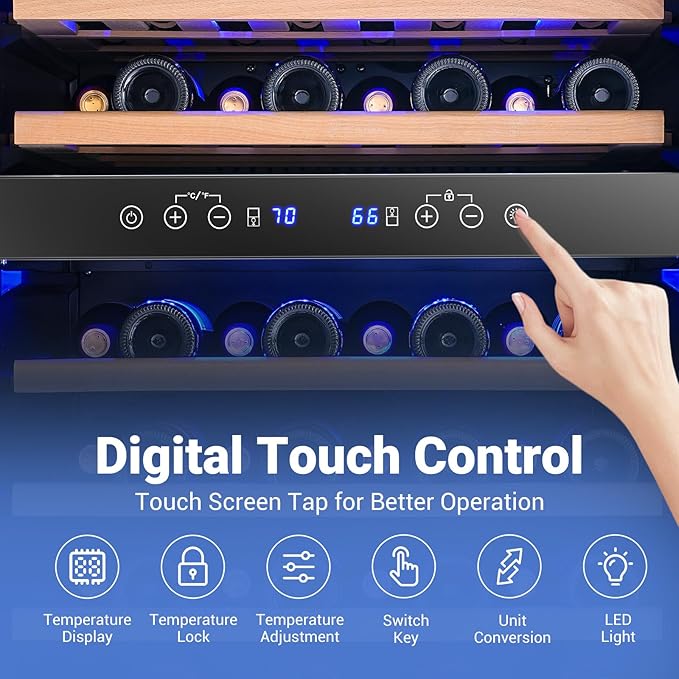 - π§γπΌπππͺπ¨π©πππ‘π ππ€π€πππ£ ππππ‘π«ππ¨γAAOBOSI Dual Zone Wine Fridge has a total of 6 adjustable, which slide out so you can easily spot and access specific bottles, and are less likely to cause any label damage, and the removable shelves are able to place various shapes and sizes of wines, and the wooden shelves also simulate more realistically the environment of the red wines in the wine cellar.