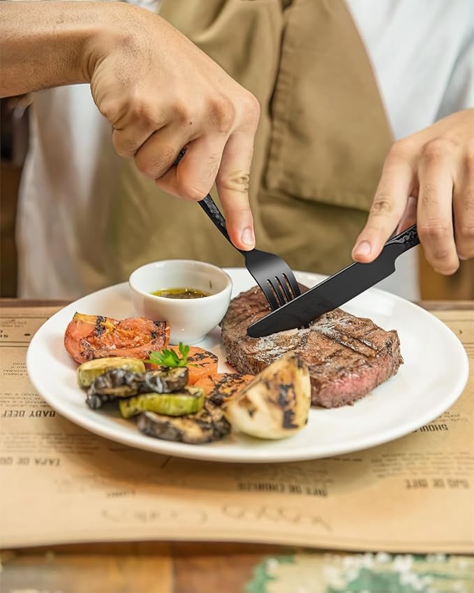 - Premium Heavy Duty Crafted: Black Flatware Set made of thick gauge food-grade stainless steel offers durability, rust&corrosion resistance. Enhanced by advanced hot forged process to strengthen durability, never bends or chips in daily use, ensure the longest-term value and optimal performance for use