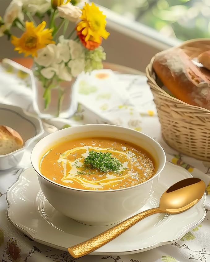 - Classy And Ergonomic Design: Distinctive with the tableware set double-sided hammered patterns on gold utensils set handles, reasonable balance of weight for ergonomic design. Perfect for both adults and big children, it offers a comfortable grip and an eye-catching look that sets it apart from the rest.