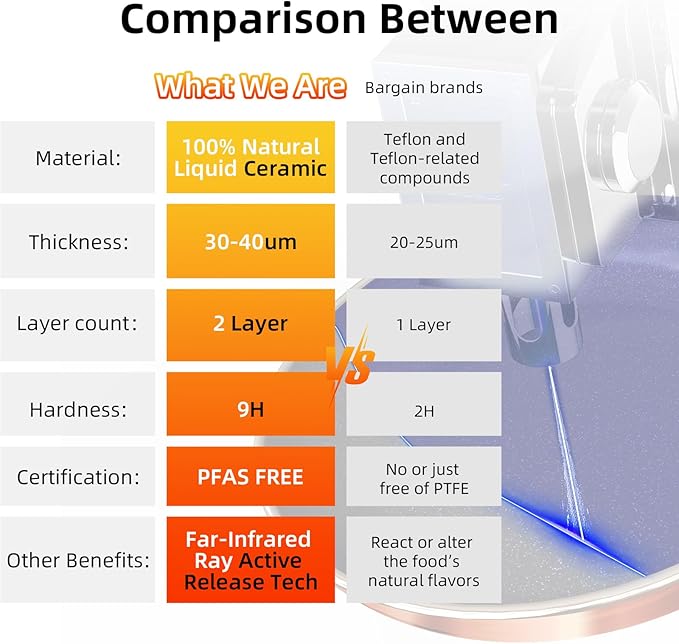 - 9H Diamond-Level Enhanced Coating: The coating achieves 9H hardness, ensuring exceptional resistance to wear, corrosion, and acids. Please note that our ceramic coating serves as an alternative to Tef*l*on. While it’s equipped with ultra non stick feature, it's not *chemically* nonstick.