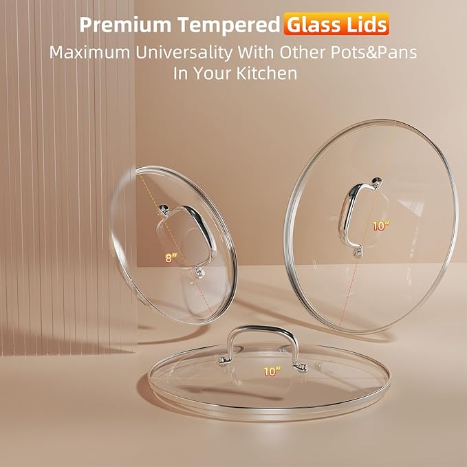 - Premium Tempered Glass Lids: The ceramic cookware set features three premium shatter-resistant glass lids that seamlessly fit multiple pots and pans. With a small ventilation opening for safe steam release during cooking, these glass lids are oven-safe up to 350°F and dishwasher-safe, providing convenience and versatility. The widened handle design of stainless steel ensures a more comfortable grip when lifting the lid.