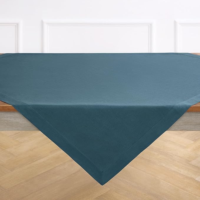 Solino Home Linen Square Tablecloth 52 x 52 Inch - 100% Pure Linen Peacock Blue Table Throw - Fete, Machine Washable Table Cloth for Winter