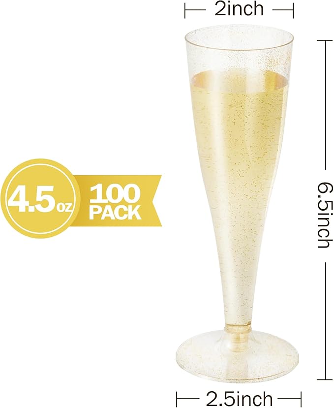 N9R Plastic Champagne Flutes - 100 Count 4.5 Oz Gold Glitter Plastic Disposable Champagne Glasses for Party Wedding Birthday Cocktail Cups