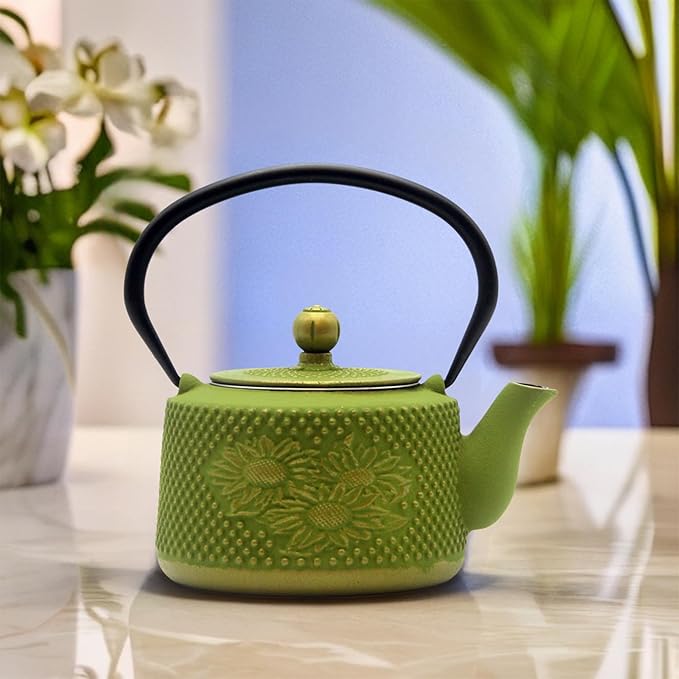 Cast Iron Teapot with Sunflower Pattern,SECHUDO Tea Kettle Coated with Enameled Interior for Loose Tea,Green Cast Iron Teapot with Stainless Steel Infuser for Stovetop Safe (28.7oz/850ml)