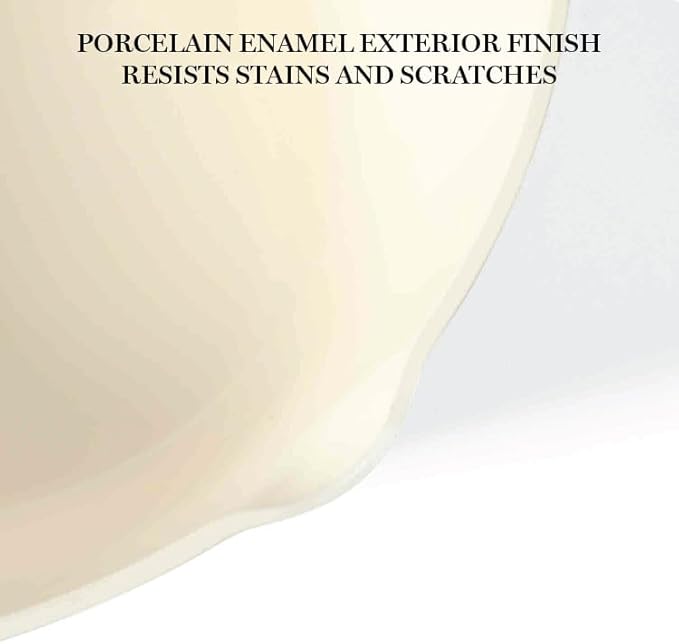 - PORCELAIN ENAMEL EXTERIOR: Glossy porcelain enamel finish resists stains and scratches. Classic linen white color is a pristine choice to match any style of kitchen or table.
