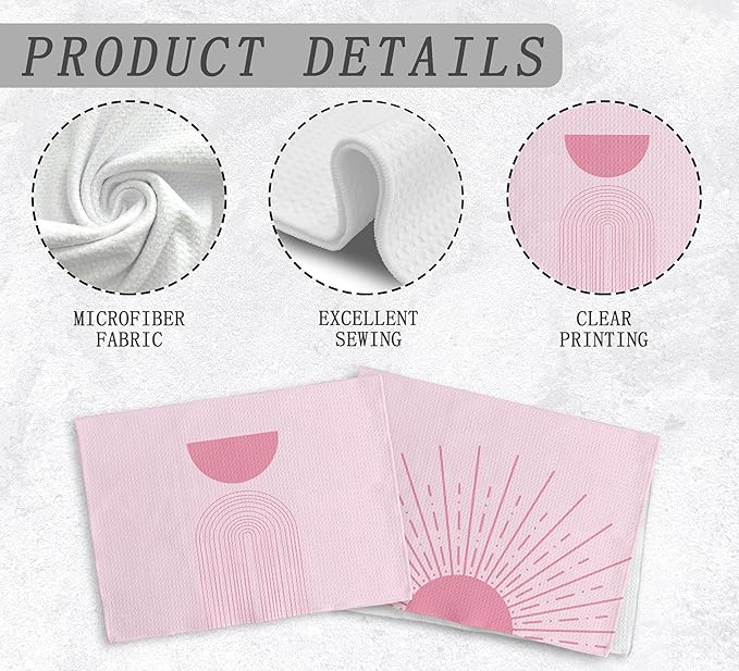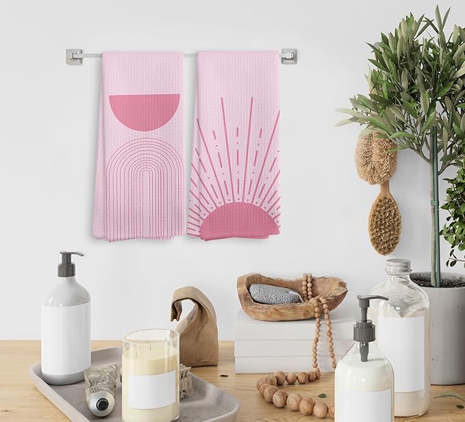 Pink Preppy Sun Moon Rainbow Kitchen Towels and Dishcloths Sets of 2, Bohemian Sunrise Hand Towels, Abstract Arch Line Drying Cloth Hand Towels for Girls Bathroom Kitchen Decor, 16×24 Inches
