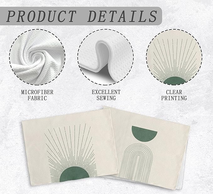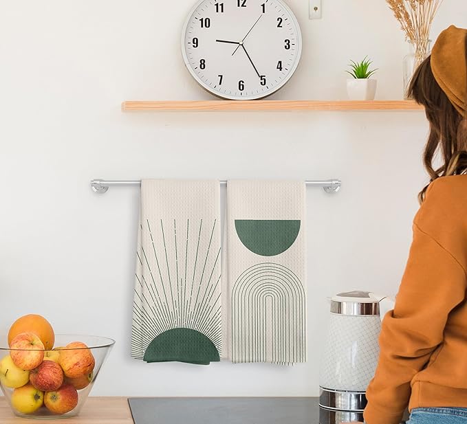 Beige Green Abstract Sunrise Kitchen Towels and Dishcloths Set of 2, Bohemian Sun Decorative Towels, Green Moon Drying Cloth Hand Towels for Bohemian Bathroom Kitchen Decor, 16×24 Inches