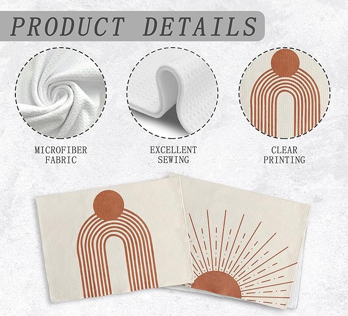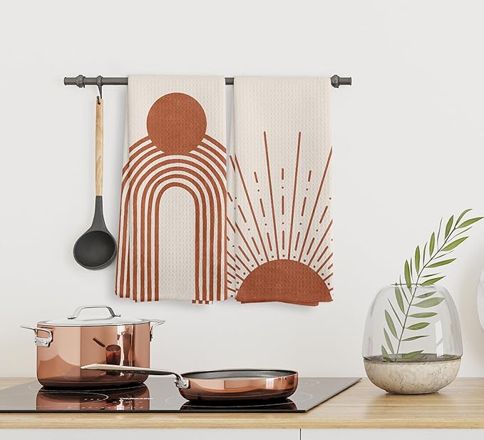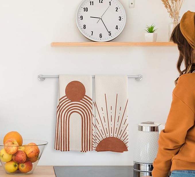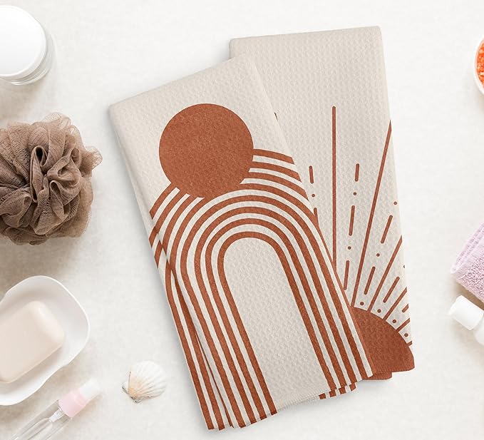 Beige Red Sunrise Moon Rainbow Kitchen Towels and Dishcloths Sets of 2, Bohemian Decorative Towels, Abstract Arch Line Drying Cloth Hand Towels for Bohemian Bathroom Kitchen Decor, 16×24 Inches