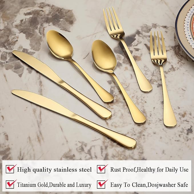 - Versatile for Every Occasion: Our gold flatware set appropriate for formal events or everyday meals. You can use it for family daily use, parties, holiday gatherings, party, restaurant, also as a great gift.