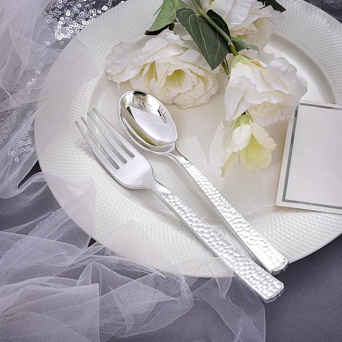 - ELEGANT DESIGN: These silver plastic silverware are shiny, simple yet stylish, brings a touch of grace to your posh party set up! silver hammered cutlery set have a unique design and classic look that is much more attractive