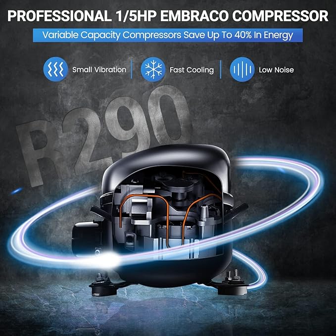 - Digital Temp Control Drink Cooler with Auto Defrost: 33-41℉ precise regulation for this commercial cooler—Using R290 refrigeration, coupled with a powerful fan and a high-efficiency brand compressor, effectively increases cooling speed. Automatic defrosting technology eliminates the hassle of manual defrosting and prevents moisture from obstructing the view from glass doors. This drink fridge operates at a noise level of less than 48dB, so it won't be too noisy even in a quiet environment