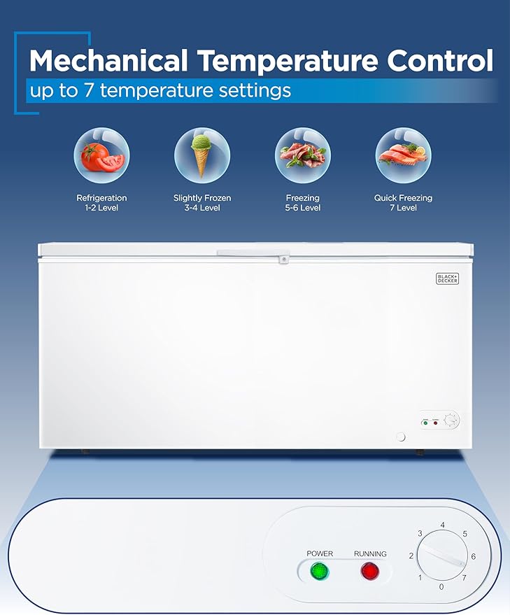 - Mechanical Temperature Control: The freezer chest includes a mechanical temperature control dial and indicator lights located on the outside, allowing precise adjustments without opening the freezer