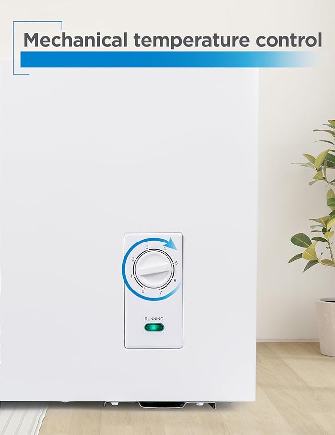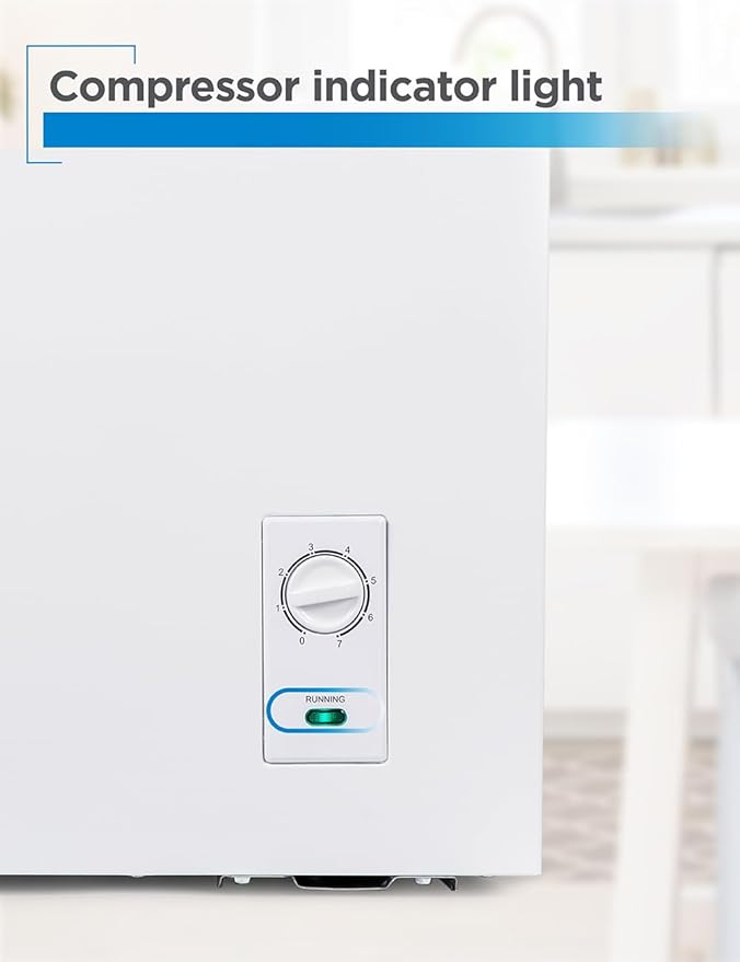 - Mechanical Temperature Control: The freezer chest includes a mechanical temperature control dial and indicator light located on the outside, allowing precise adjustments without opening the freezer.