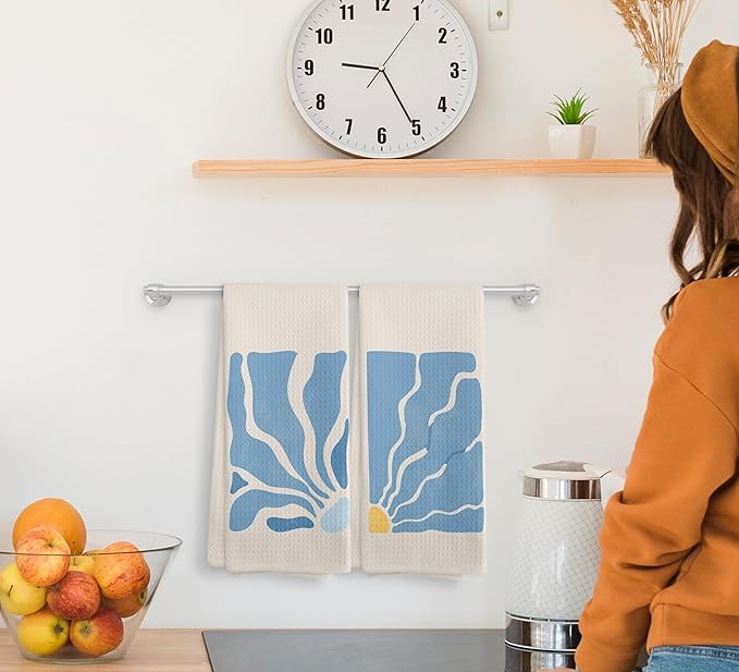 Beige Bohemian Flower Kitchen Towels and Dishcloths Set of 2, Abstract Flower Decorative Hand Towels, Blue Dorm Decor, Blue Botanical Drying Cloth Towels for Preppy Bathroom, 1624 Inches