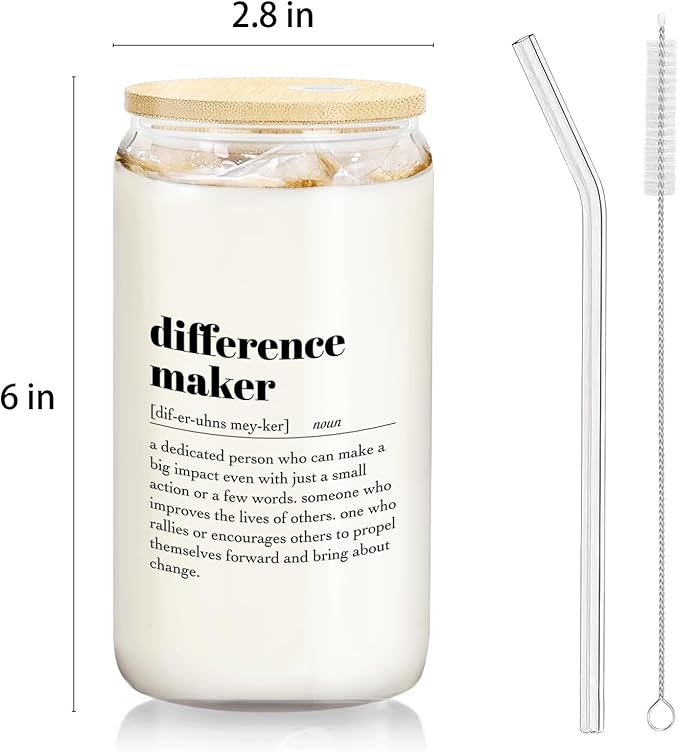 Difference Maker Glass Cup with Lids and Straws 14oz - Appreciation Gifts Thank You Gifts for Boss Leader Teacher Mentor Coach Manager, Glass Coffee Tumbler Drinking Jars with Cleaning Brush