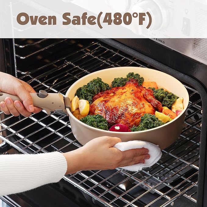 - Easy Storage - Save up to 70% more space with stackable pots and pans set and detachable handles, allowing for storage in cabinets or RVs.
