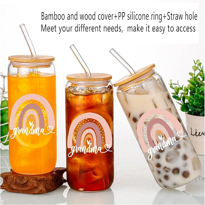 Grandma Glass Cups with Lids and Straws, Glasses Drinking Set, Mother's Day, Birthday, Christmas Gifts for Grandma or Mom, 16 Oz