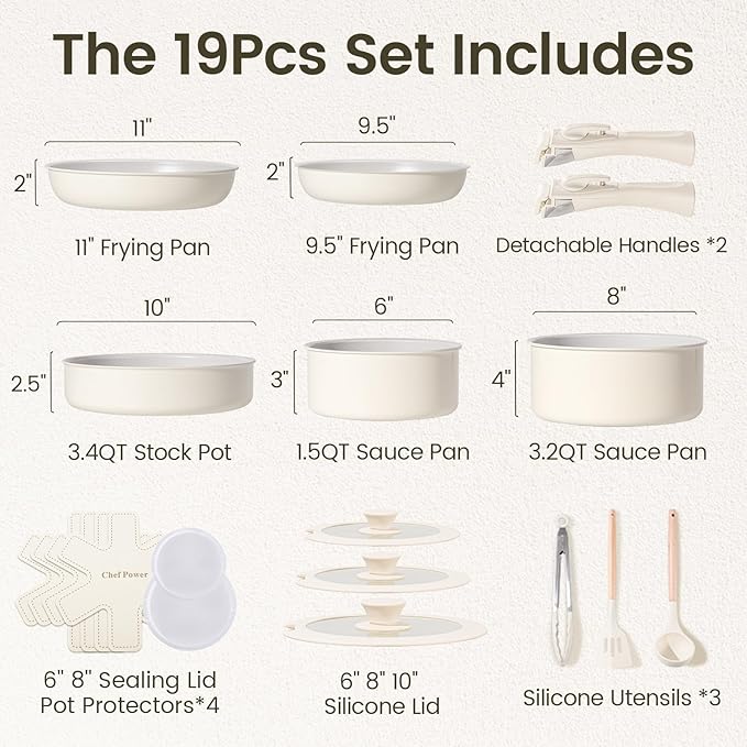 - Easy To Store - Chef Power removable cookware set makes kitchen storage simple, easy to stack and saves 70% space.