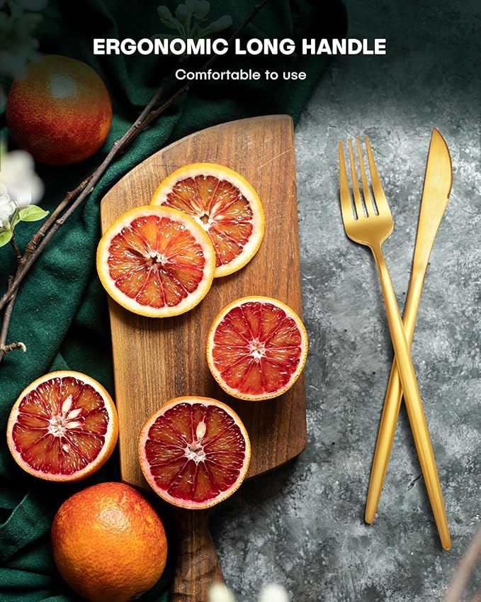 - Premium Matte Gold Silverware Set - 20 pieces flatware set specially designed for 4 people(Includes 4 dinner forks, 4 salad forks, 4 dinner spoons, 4 tea spoons and 4 dinner knives). The matte surface makes the cutlery set more elegant, suitable for kitchens, restaurants, cafes and hotels. And it can also help your dinner full of high-end feeling while having a party.