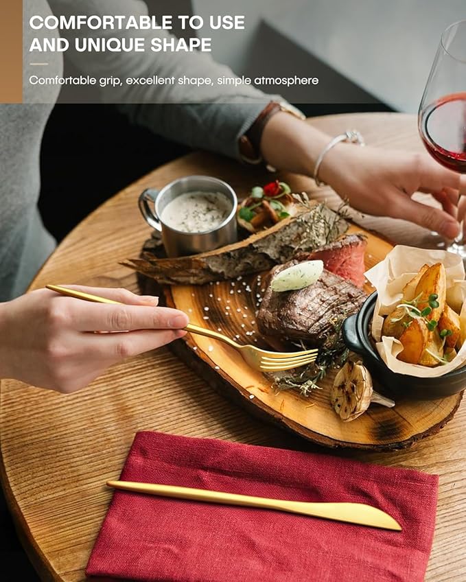 - Exquisite Workmanship -Crafted from food-grade stainless steel, these Gold Flatware Set offers superior durability and safety. Smooth surface and edges, fade-resistant, rust-free, Dishwasher Safe. Enjoy a seamless dining experience with elegant&hassle-free modern tableware set.