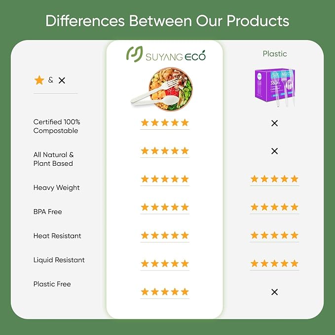 - 【MULTI-OCCASION】You can use these compostable cutlery bulk for parties, camping, daily gatherings and special events. After the party is over, you never have to worry about doing the dishes again.