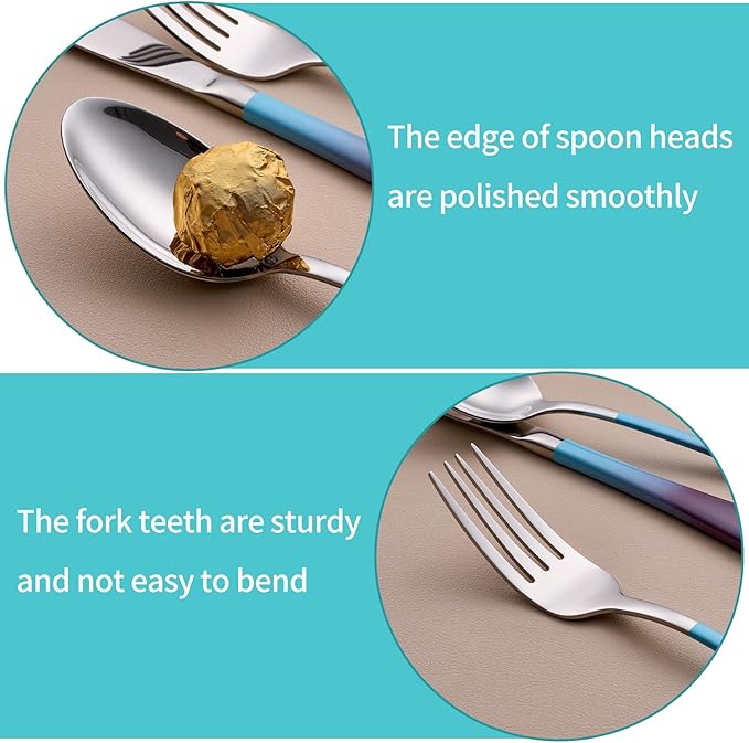 - 【Durable 18/0 Stainless Steel Silverware Service for 4】- The nice weight stainless-steel silverware set with copper polish surface, it offers eye-catching good looks, smooth polished surface made it more beautiful. The modern and colorful handle design, whether setting formal table for brunch or dinner with family or friends. durability and toughness suitable for everyday use or special occasions.