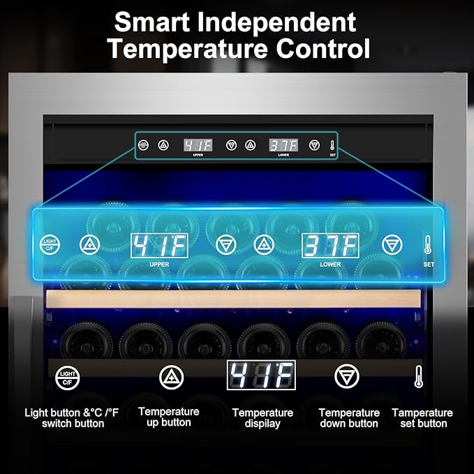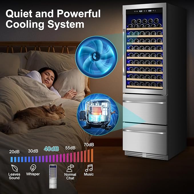 - Professional and Efficient Dual-Zone Cooling: Powered by a robust compressor and strategic fan placement, our wine cooler ensures precise cooling(upper zone: 41°F -72°F,lower drawer: 37°F - 64°F). Enjoy quiet operation, energy efficiency, and consistent temperature control for your wine and beverage