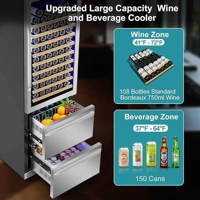 - Large Capacity Marvel: Experience sheer storage prowess with our 24-inch dual zone wine and beverage refrigerator. Store up to 108 wine bottles and 150 cans in 9 sturdy shelves and 2 cavernous drawers, preserving your beverage and wine in style