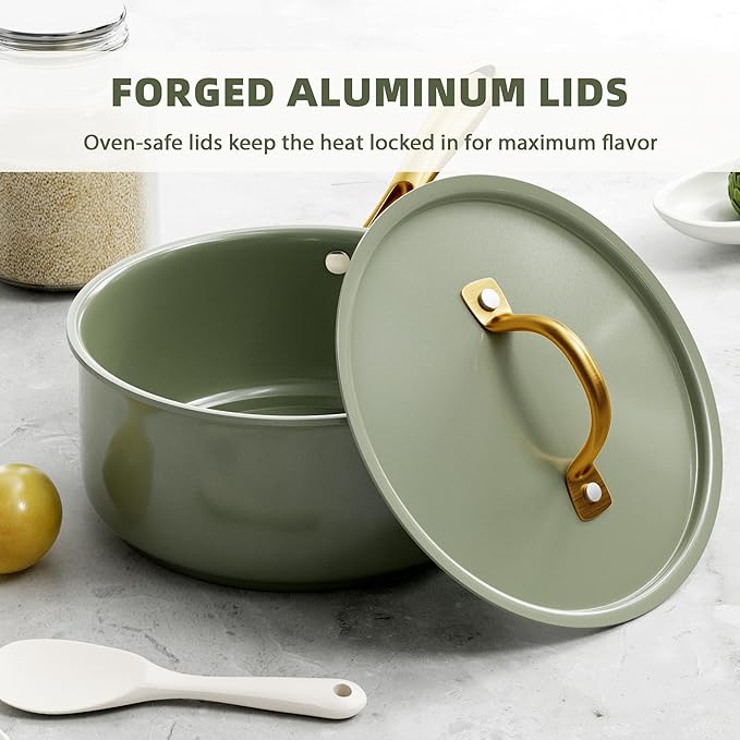 - TOXIN-FREE: This pots and pans set's healthy ceramic nonstick coating is free of PFAS, PFOA, lead, and cadmium, making them safe for you, your family, and the environment.