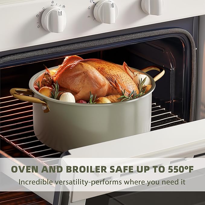 - FOR ALL STOVETOP & OVEN SAFE: The innovative induction base delivers uniform heat distribution on all cooktops, induction, gas, electric, halogen or ceramic. Plus, oven safe up to 550°F, making the non stick pots and pan set great for bread baking and roasts.
