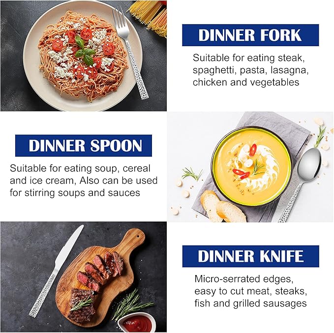 - ELEGANT APPEARANCE: Stylish hammered design on the front side of each square handles; Mirror polishing makes the silverware more shiny; Fashionable and elegant appearance can be paired with different styles of dining tables to create an elegant and luxurious dining atmosphere to improve your dining experience of your family and dinner guest