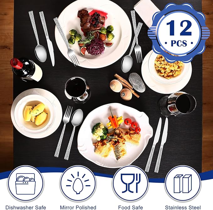 E-far 12-Piece Hammered Forks Spoons and Knives Set, Silverware Set for 4, Stainless Steel Square Flatware Set for Home Kitchen Restaurant, Mirror Polished & Dishwasher Safe