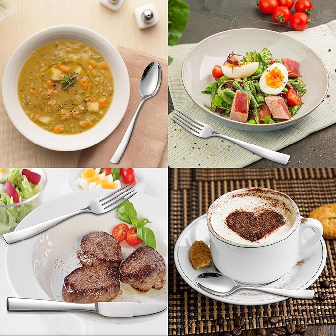 - 20-PIECE SET: includes 5 each of: dinner fork, salad fork, dinner knife, dinner spoon, and teaspoon. Oversized spoons are one of the features of our silverware set, and a big bite of food is super satisfying.