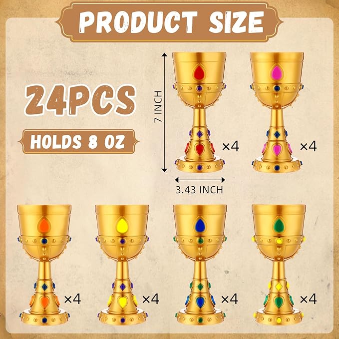 24 Pcs Medieval Molded Crown Goblets 8 oz Colorful Jeweled Goblet Vintage Plastic King Queen Party Cups Medieval Party Decorations for Halloween Carnival Drinking Supplies