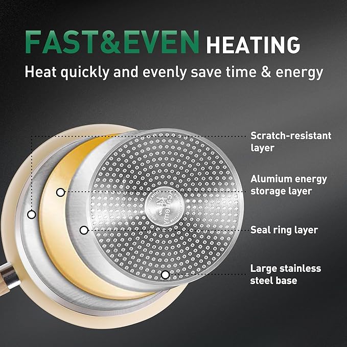 - Heats Quickly & Evenly: This cookware uses professional grade aluminum core that conducts heat quickly and evenly with precise temperature control, which will save time and energy. This induction frying pan set can adopts various cooking methods to make delicious food to satisfy your stomach